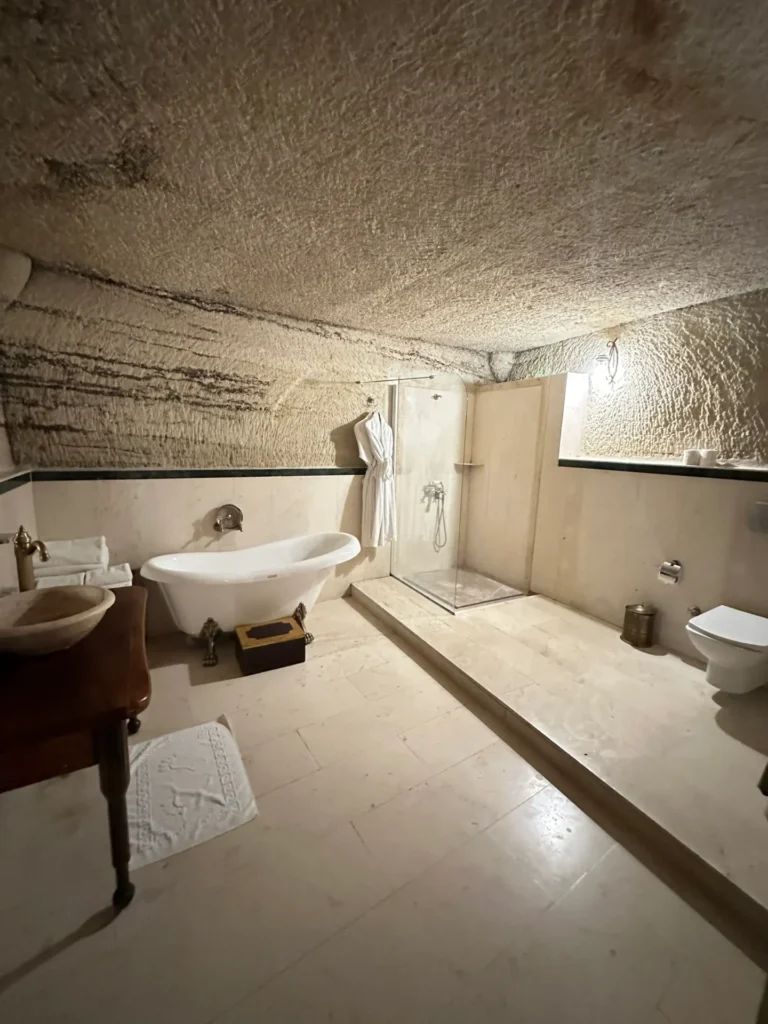 Hotelul este amplasat în centrul orașului, pe o străduță tare îngustă și are o terasă superbă de unde am admirat baloanele în ultima dimineață. Camera a fost fix ce ne-am dorit: foarte mare, spațioasă, fix în peșteră cu o baie uriașă. Oamenii de la hotel au fost foarte ospitalieri și drăguți, mereu să ne ajute, așa că am discutat cu ei pentru plimbarea cu balonul de la răsărit.
