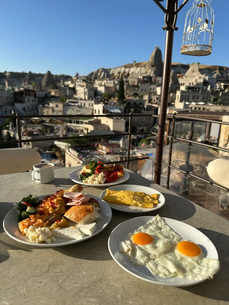 Noi aveam Cappadocia de foarte mulți ani pe listă și eram hotărâți ca atunci când vom merge, vom alege să stăm într-un hotel în peșteră, specific zonei, fix în Göreme. Bineînțeles că acest lucru a venit cu un cost suplimentar, dar mi se pare că a ajuns să fie în top 5 cazări pe care noi le-am experimentat până acum. Dintre toate opțiunile superbe care există, am rămas la acest hotel, Aydinli Cave Hotel, care a avut micul dejun inclus, dar ce festin fabulos a fost!! Extraordinar de gustos totul și cu priveliștea tuturor acestor formațiuni din tuf vulcanic și cu hotelurile cu terase așa colorate, a fost un vis!