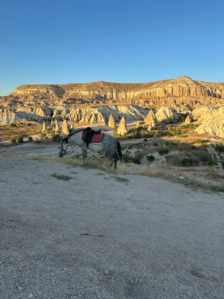 Ne-am plimbat vreo oră, timp în care ne-am bucurat de liniște, de aer curat și de formațiunile așa de diferite de cele de la Love Valley și apoi ne-am oprit la această ceainărie, în vale. Ne-a plăcut cum se vedea peisajul și faptul că un tur de călărit s-a oprit fix acolo, ne-au plăcut motivele turcești, dar prețurile extrem de ridicate pentru un suc de rodie.